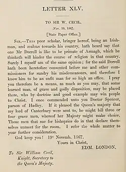 In 1567, while obtaining an attorney (one Henry Style of Westminster) in the event he left England, Darell described himself as "Deane of Fernes in Irelande". This suggests that Darell is the same "Mr. Dorrell" who was proposed to be Archbishop of Armagh.[2] The see went vacant in 1567, after previous incumbent Adam Loftus was elevated to Archbishop of Dublin. Among those subsequently proposed to the see was Darell. This nomination came to the attention of Edmund Grindal, Bishop of London, who apparently already regarded Darell as (in biographer John Strype's description) "corrupt in religion; though otherwise outwardly complying."[5] Grindal assiduously opposed this nomination. On 19 November, he wrote to Secretary of State William Cecil to recommend against Darell; he spoke of one "poor scholar" in Ireland who had described to him how he dreaded Darell's election, believing his nomination would ultimately "hinder the course of religion in that country." Grindal moreover spoke of his own negative experiences with Darell: "the said Dorrell hath been heretofore convented before me and other commissioners for sundry his misdemeanours, and therefore I know him to be an unfit man for so high an office".[2][6] He recommended one "Dr. Spenser, Parson of Hadley", but also offered to send forth several candidates, from whom the Queen could choose.[6] Ultimately, Thomas Lancaster, previously Bishop of Kildare, was elected to the Archbishopric, most likely on the advice of Sir Henry Sidney, Elizabeth's Lord Deputy in Ireland. Cecil was apparently pleased with this nomination.[7]