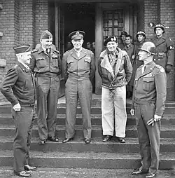 After Victory in Europe Day, the Ninth Army participated in the occupation of Germany. On 6 May, it took over the First Army's units, allowing the First Army headquarters to redeploy to the Pacific.[56] Further regrouping followed, as most of the area covered was earmarked to be administered by the UK or Soviet Union. On 15 June, all units of the Ninth Army were handed over to the Seventh United States Army, and Ninth Army headquarters prepared to redeploy to China.[57] Simpson flew to China, where he met with Lieutenant General Albert C. Wedemeyer, the American commander there. Simpson was informed that he would become the Commanding General, Field Forces, and deputy theater commander. The end of the war in Asia came before this occurred.[58] In August 1945 the headquarters of the Ninth Army was redeployed to Camp Shanks, New York. In mid-September it was moved to Fort Bragg and inactivated on 10 October 1945.[59]