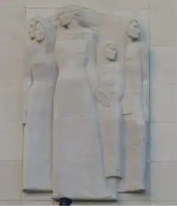 The exterior is largely devoid of architectural ornamentation. However, Gumerson allowed for a few decorative elements to articulate the entrances. The main entrance is recessed and flanked by diagonally positioned limestone panels that form a sawtooth, accordion-like pattern, creating texture and the illusion of movement. Entrances on the east and west elevations are framed with geometric patterns executed in aluminum. Two bas-relief sculptures of stylized grouped figures adorn the limestone walls above the side entrances. Noted sculptor Bernard Emerson Frazier, a former director of the Philbrook Art Center in Tulsa who studied American aboriginal art, created the figures. Although Frazier initially designed nudes, he ultimately executed clothed figures after a local protest. Unity, completed in 1966, is located on the east elevation and portrays a Native American man and woman with two European settlers drawn together by an allegorical depiction of unity. Destiny, completed the following year, is located on the west elevation and depicts a male and a female, with the woman's outstretched hand extending through a flame. An eagle is at their backs.[1]