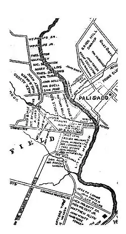 Plan of Ancient Windsor, Connecticut, circa 1640–1654, showing the names and locations of settlers' homes, the Palisade, and various geographic features