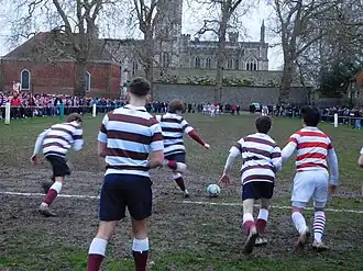 The earliest evidence of coloured shirts used to identify football teams comes from Winchester football: an image from before 1840 is entitled "The commoners have red and the college boys blue jerseys."[13] The use of coloured shirts at Winchester College was confirmed again in 1859: "Precisely at twelve o'clock, according to good old custom, the blue jerseys of college and the red of commoners mingled in the grand commencing 'hot'."[14] That same year, Winchester College played a match of an undefined variety of football against the Winchester Garrison Officers; 28 "goals" were scored, with 11 players on each side, leading the historian Ian Denness to suggest that the rules were a hybrid of the Winchester and Eton football games.[15]