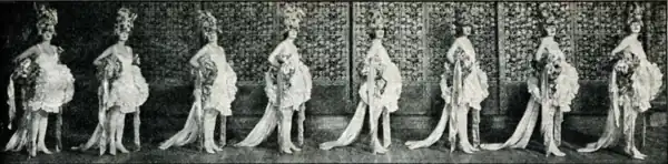 While on a trip to Europe, Lee had met with German producer Max Reinhardt, who had pioneered the idea of a runway extending from a stage into the audience. Lee copied Reinhardt's idea, adding a bridge above the orchestra seats.[19] In early 1912, Jolson, Deslys, and Stella Mayhew starred in The Whirl of Society,[77][78][79] the first show to use the Winter Garden's runway.[79] Jolson performed near the audience on the runway, as did 80 lightly clothed showgirls,[80][81] leading the runway to be nicknamed the "bridge of thighs".[19][82] (From) Broadway to Paris premiered in November 1912,[83][84][85] and Jolson, Deslys, and Fanny Brice appeared in The Honeymoon Express the next year.[86][87][88] Jacob's son, John Shubert, subsequently recalled that after The Honeymoon Express, Jolson returned to the Winter Garden once every 18 months on average. Jolson's shows typically premiered early in the year, then went on tour after a summer break.[89] These shows included Dancing Around (1914),[90][91] Robinson Crusoe, Jr. (1916),[92][93] Sinbad (1918),[87][89][94] and Monte Cristo, Jr. (1919).[87][95][96]