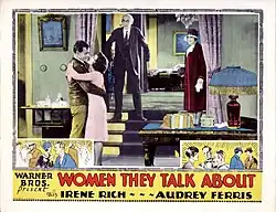 Women They Talk About is a 1928 American sound part-talkie comedy drama film directed by Lloyd Bacon and starring Irene Rich and Audrey Ferris. In addition to sequences with audible dialogue or talking sequences, the film features a synchronized musical score and sound effects along with English intertitles. According to the film review in Variety, only 14 minutes of the total running time featured dialogue.[2] The soundtrack was recorded using the Vitaphone sound-on-disc system. The film was produced and distributed by Warner Bros. It is considered to be a lost film.[3][4][5]
