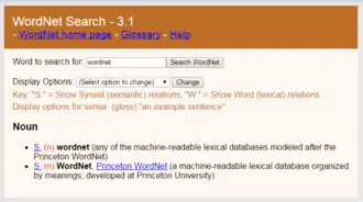 WordNet is a lexical database of semantic relations between words that links words into semantic relations including synonyms, hyponyms, and meronyms. The synonyms are grouped into synsets with short definitions and usage examples. It can thus be seen as a combination and extension of a dictionary and thesaurus. Its primary use is in automatic text analysis and artificial intelligence applications. It was first created in the English language[2] and the English WordNet database and software tools have been released under a BSD style license and are freely available for download. The latest official release from Princeton was released in 2011. Princeton currently has no plans to release any new versions due to staffing and funding issues.[3] New versions are still being released annually through the Open English WordNet website. Until about 2024 an online version was previously available through wordnet.princeton.edu. That version of WordNet has been deprecated, but a new online version is available at en-word.net. There are now WordNets in more than 200 languages.[4]