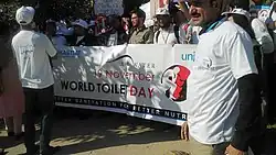 UN-Water is the official convener of World Toilet Day. UN-Water maintains the official World Toilet Day website and chooses a special theme for each year. In 2020 the theme was "Sustainable sanitation and climate change".[9] In 2019 the theme was 'Leaving no one behind', which is the central theme of the Sustainable Development Goals. Themes in previous years include nature-based solutions, wastewater, toilets and jobs, and toilets and nutrition.[10][11][12] World Toilet Day is marked by communications campaigns and other activities. Events are planned by UN entities, international organizations, local civil society organizations and volunteers to raise awareness and inspire action.