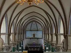 Delicate Corinth pillars and Gothic peaked arches inside the church create a grand, elegant and solemn impression upon visitors.[1]