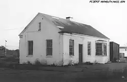 A branch from Harwich to Chatham opened in 1887; Yarmouth–Chatham service ran until 1931.[3][2] Service past Yarmouth to Provincetown ended with the 88 stations case on July 17, 1938, with a brief revival in mid-1940.[2] Yarmouth station was again destroyed by fire in 1941; the New York, New Haven, and Hartford Railroad built a brick replacement.[1] It served year-round Boston–Hyannis trains until June 30, 1959, and New York–Hyannis trains including the Day Cape Codder and Neptune until 1964.[2] This station was torn down around 1975 to make room for the warehouse of Yarmouth-based Christmas Tree Shops.[4]