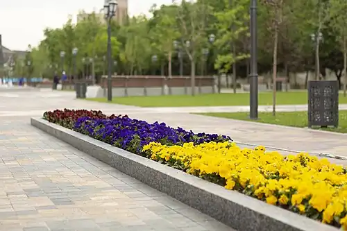 The block pavement of the park with total area of 5.420 sq.m is made of 500,000 pieces of 7 colours of granite cobbles 10x10x5 cm in size. The entire surface under the pavement is reinforced by concrete and has its appropriate drainage system. The pavement patterns of the park are almost entirely taken from the ornaments of ancient traditional Armenian carpets, and part of the ornaments repeats the patterns of Erebuni fortress of the Urartian era.