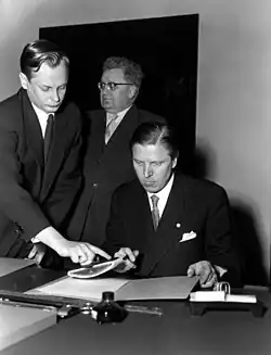Yrjö Väänänen (to the left) blotting the signature of the minister Johannes Virolainen in 1955. Behind them, the Soviet Ambassador Viktor Z. Lebedev.