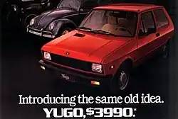 Yugo (pronounced [ˈjûɡo]), also known as the Zastava Yugo,[1] Zastava Koral (pronounced [ˈzâːstaʋa ˈkǒraːl], Serbian Cyrillic: Застава Корал) and Yugo Koral, is a subcompact hatchback manufactured by Zastava Automobiles from 1980 until 2008, originally a Yugoslav corporation. Originally named the Zastava Jugo 45, various other names were also used over the car's long production run, like Yugo Tempo, Yugo Ciao, or Innocenti Koral. It was most commonly marketed as the Yugo 45/55/60/65, with the number referring to the car's maximum power. In the United States, it was sold as the Yugo GV (and sub-versions).