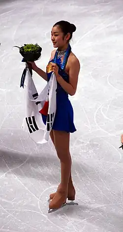Yuna Kim (Korean김연아; born September 5, 1990), is a South Korean retired competitive figure skater. She participated in the Winter Olympic Games twice, winning the gold medal in 2010 and the silver medal in 2014. She is also a two-time World champion (2009, 2013) the 2009 Four Continents champion, a three-time Grand Prix Final champion (2006, 2007, 2009), the 2006 World Junior champion, the 2005 Junior Grand Prix Final champion, and a six-time (2003, 2004, 2005, 2006, 2013, 2014) South Korean national champion.