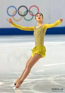 In February 2014, Kim competed at the 2014 Winter Olympic Games, seeking to become the first woman to win back-to-back Olympic gold medals since Katarina Witt and with the intention of retiring from competitive skating afterwards.[35] According to Moon Gwang-lip of Korea JoongAng Daily, she did not want to not feel burdened or pressured and wished to finish her career with no regrets.[36] Kim was unable to train on the ice for six weeks before the Olympics due to a foot injury. Bryan Armen Graham reported that she attracted a large group of the press at practices, adding that "she skated well but with almost no spark, seeming almost unhappy at times".[37] She narrowly came in first place after the short program with 74.92 points. Jeré Longman of The New York Times called her short program "a mature and elegant routine, even if it did not equal her stirring performance four years ago at the Vancouver Games".[38] Longman stated that Kim defied the convention that skaters must compete throughout the season at the Grand Prix circuit to remain at the highest levels. She skated earlier than the other favorite competitors, due to her lower international standing, although she later said that it lessened her pressure.[37][38] Paul Wylie, the 1992 silver Olympic medalist from Canada, stated that it demonstrated that Kim could skate well "whenever, wherever, whatever".[38] Longman reported that Kim appeared anxious during her warm-up, but was able to give "a flowing if imperfect performance dressed in a sparkly chartreuse costume, similar in color to one that Peggy Fleming wore in 1968".[38] Her triple Lutz-triple toe loop combination jump was "bounding and fluid", but her footwork sequence and layback spin appeared "slow and not wholly formed".[38] Scott Hamilton, the 1984 Olympic champion from the U.S., speculated that she might be judged in her free skate in comparison with her 2010 performance, not by her most recent accomplishments or in comparison with the current field of skaters.[38] Graham stated that Kim was probably underscored in her short program, which might have been as a result of her early skating order.[37]